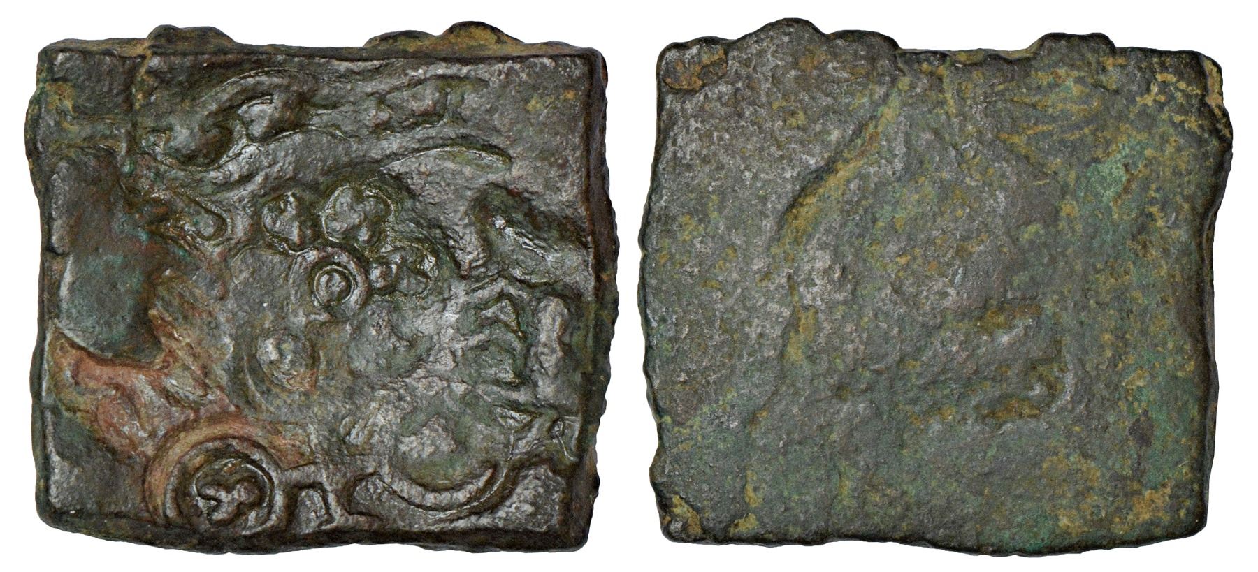 Ancient Malwa, Vidisha region, post-Mauryan uninscribed punch-marked copper coin, (200-150 BC), Pieper 473, 6.96g. Obv: Five punches, six-armed symbol in centre, horse to left, elephant o right, 'Ujjain' symbol with taurines in orbs above, 'and river with fishes below. Rev: Blank.