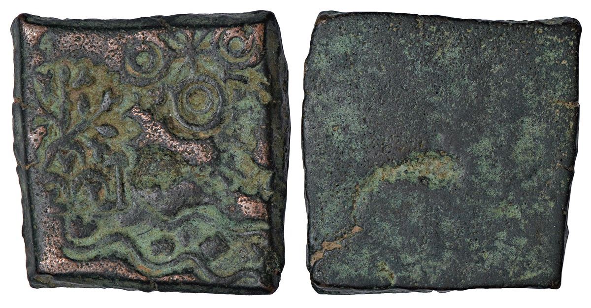 Ancient Malwa, Vidisha region, post-Mauryan uninscribed punch-marked copper coin, (200-150 BC), not listed in Pieper, 10.39g. Obv: Four punches, river with fishes at the bottom, horse facing right above, a tree emanating out of a venerated three-arched hill with taurines in arches to left and 'Ujjain' symbol with small 'Ujjain' symbols in each orb and a cross superimposed on it to right. Rev: Blank.