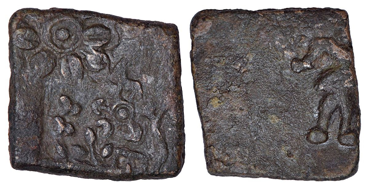 Ancient Malwa, Vidisha region, post-Mauryan uninscribed punch-marked copper coin, (200-150 BC), similar to Pieper 420 but different undertype, 7.30g. Obv: Traces of a single punch with symbolic configuration (tree-in-railing, taurines, six-armed symbol, wavy line) partly obliterated under a bold countermark of lotus. Rev: Human figure, standing facing, holding a water pot.