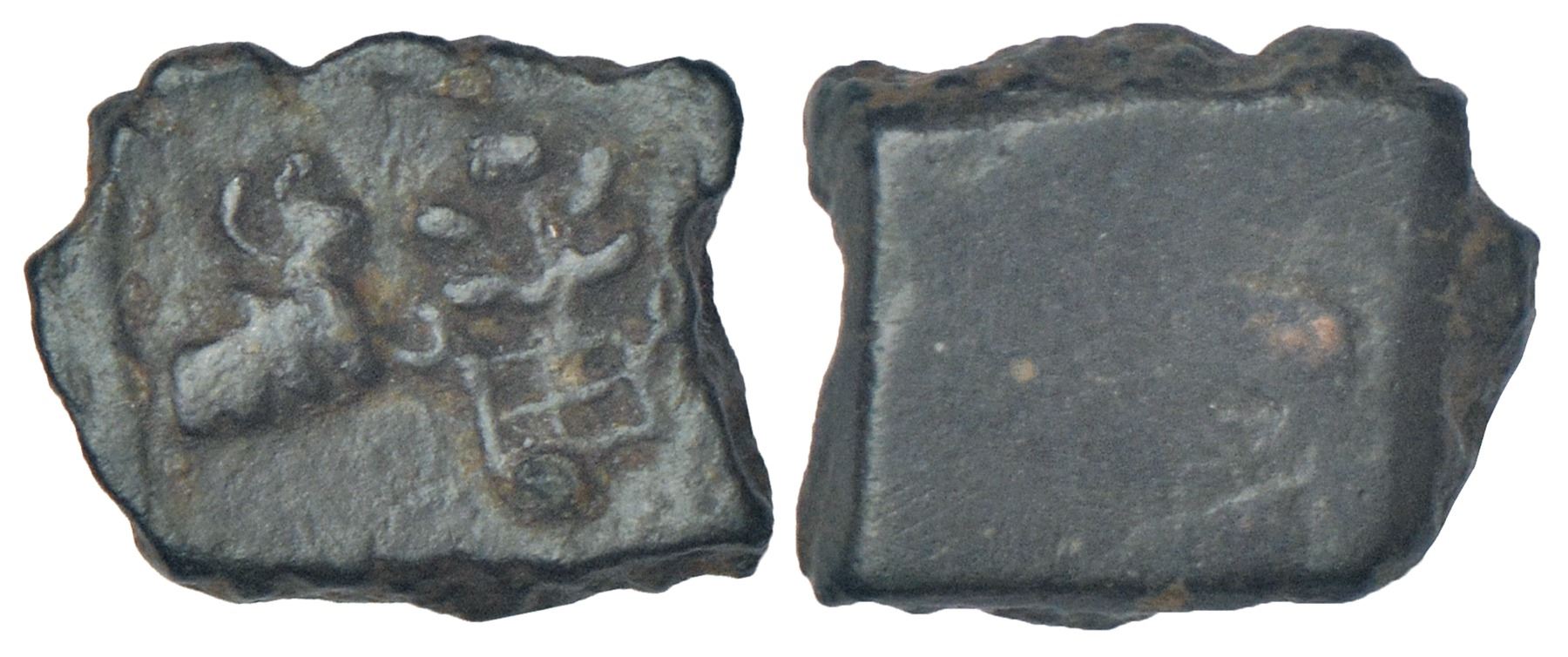 Ancient Malwa - post-Mauryan uninscribed die-struck copper coin of Ujjain/Mandasor area, 'bull' type, (c.250-200 BC), PAIC 724, 1.44g. Obv: Bull facing right towards a tree-in-railing. Rev: Plain.