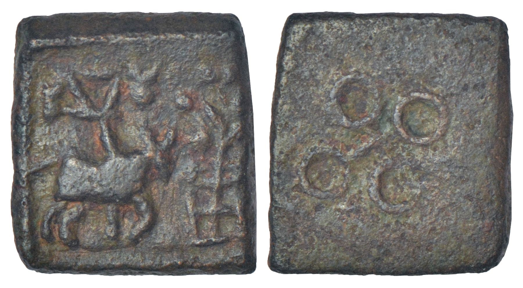 Ancient Malwa - post-Mauryan uninscribed die-struck copper coin of Ujjain/Mandasor area, 'bull' type, (c.250-200 BC), PAIC 727, 3.13g. Obv: Bull walking facing right, triangle-headed standard flanked by taurines on its back; tree-in-railing to right. Rev: 'Ujjain' symbol with plain orbs.