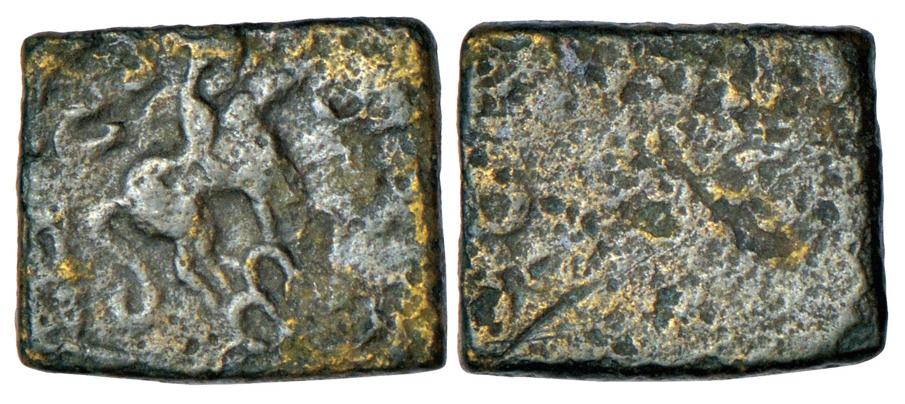 Ancient Marathwada / Western Vidarbha - uninscribed die-struck copper coin of pre-Satavahana period (200-150 BC), unpublished in major sources, 2.81g. Obv: Lion with curved tail standing on a six-arched hill; traces of other symbols above. Rev: Traces of 'Ujjain' symbol and a tree-in-railing.