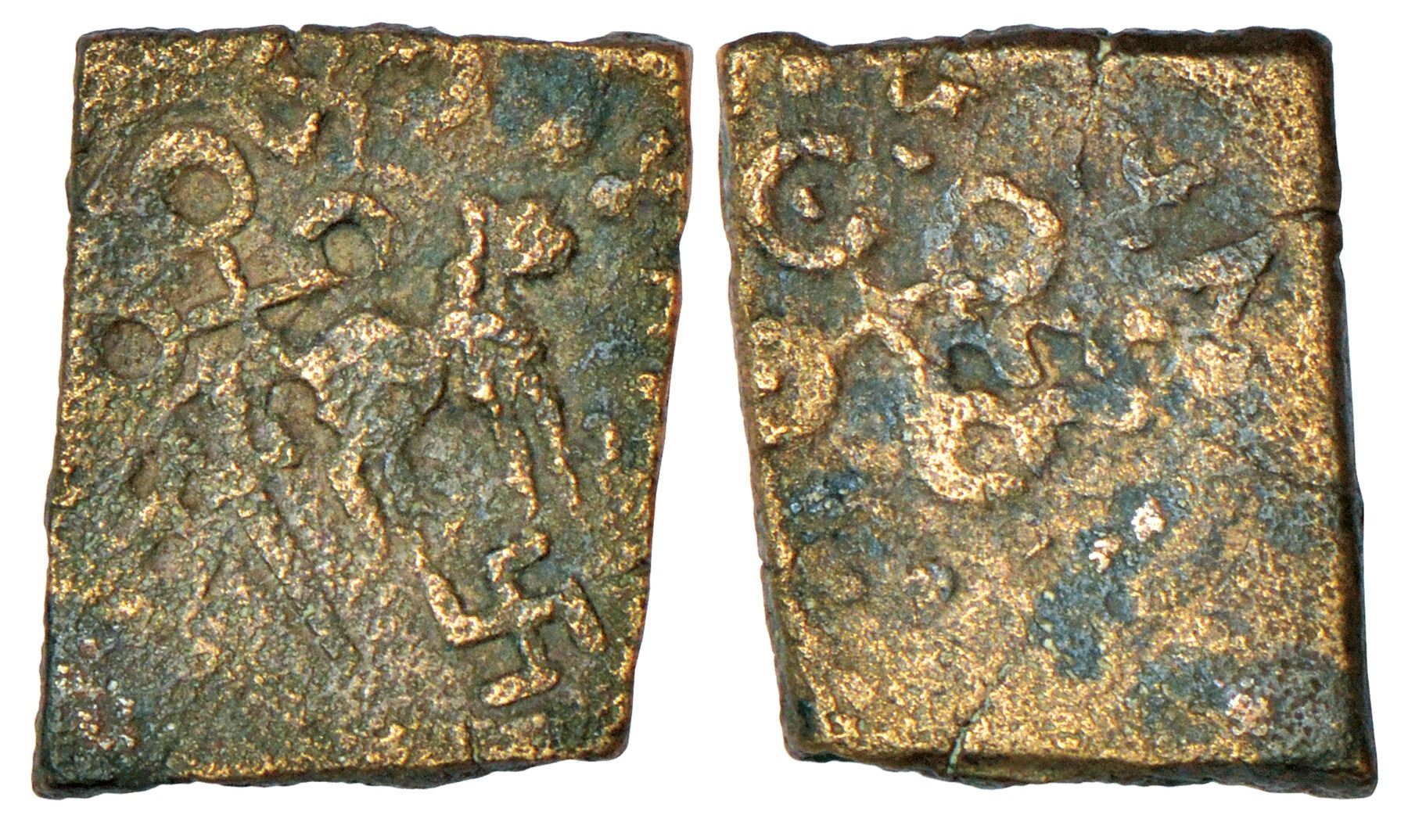 Ancient Marathwada, post-Mauryan inscribed die-struck monarchical coinage - copper coin of Balamitra (200-150 BC), unlisted in major sources, 4.29g. Obv: Lion standing above a Swatika, triangle-headed standard behind and traces of legend Balamitasa to right; counterstruck 'Ujjain' symbol to left. Rev: 'Ujjain' symbol in dotted circle, traces of Brahmi legend Balamitasa from the undertype.