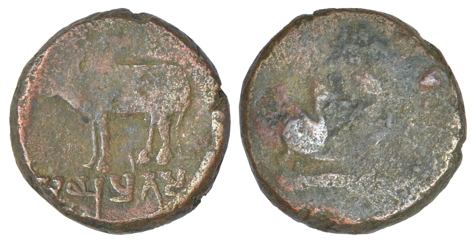 Ancient Saketa region - monarchical die-struck coinage of Ayodhya area, copper coin of Ayumitra, (c.200-300 AD), PAIC 1064, 6.90g. Obv: Bull standing facing left, Brahmi legend Ayumitrasa below. Rev: Peacock facing palm tree, wavy line below.