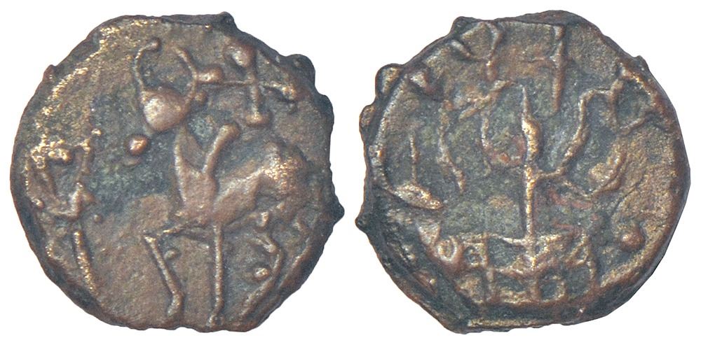 Ancient Vatsa region - inscribed cast coinage of Kaushambi area (c.200-150 BC), 'lanky bull' series, nominative type, PAIC 1139, 1.12g. Obv: Bull standing facing left; triangle-headed standard to left, small 'Ujjain' symbol above. Rev: Tree-in railing; Brahmi legend Navikasa above.