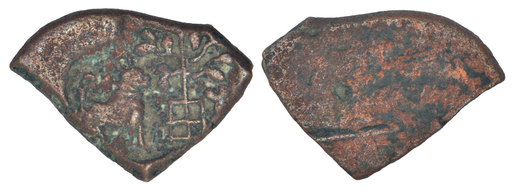 Ancient Vidarbha/Marathwada region, post-Mauryan pre-Satavahana uninscribed die-struck coinage, (c.200-150 BC), 'bull' type copper coin, not listed in PAIC, 3.80g. Obv: Bull standing facing right; tree-in-railing to right. Rev: Traces of a device that has been struck.