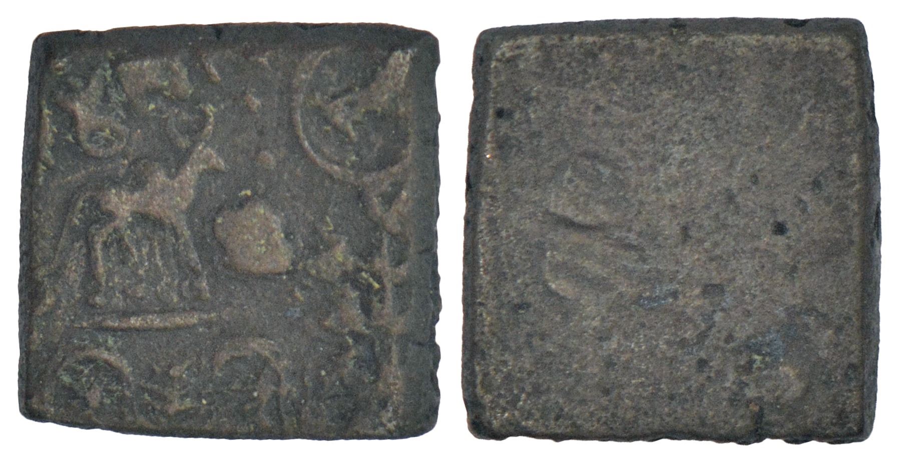 Ancient Vidarbha - post-Mauryan inscribed die-struck copper coin of Damabhadra (c.200-150 BC), PAIC 2412, 3.19g. Obv: Bull standing facing right, small Shrivatsa symbol in his front, wavy line with fishes below, tree-in-railing to right, circle with rabbit to top left; Brahmi legend (Da)mabhada… above the bull. Rev: Blank.