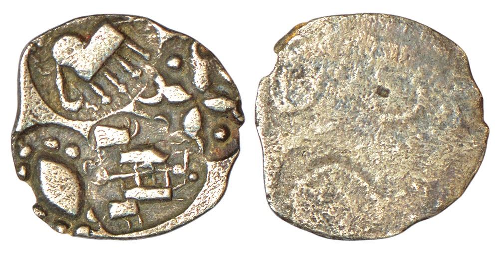 Archaic Silver punch marked coin - Wainganga-Mahanadi Divide, sometimes attributed to 'Vidarbha', 'Chedi' or 'Kalinga' Janapada, (c.300-200 BC), light ½ Karshapana standard, 1.03g. Obv: four marks in ABCD configuration -1 x elephant, 1 x a grain-like pellet within a dotted border, 1 x a pair of oxen yoked to a plough and 1 x four fishes arranged in a cross facing each other.