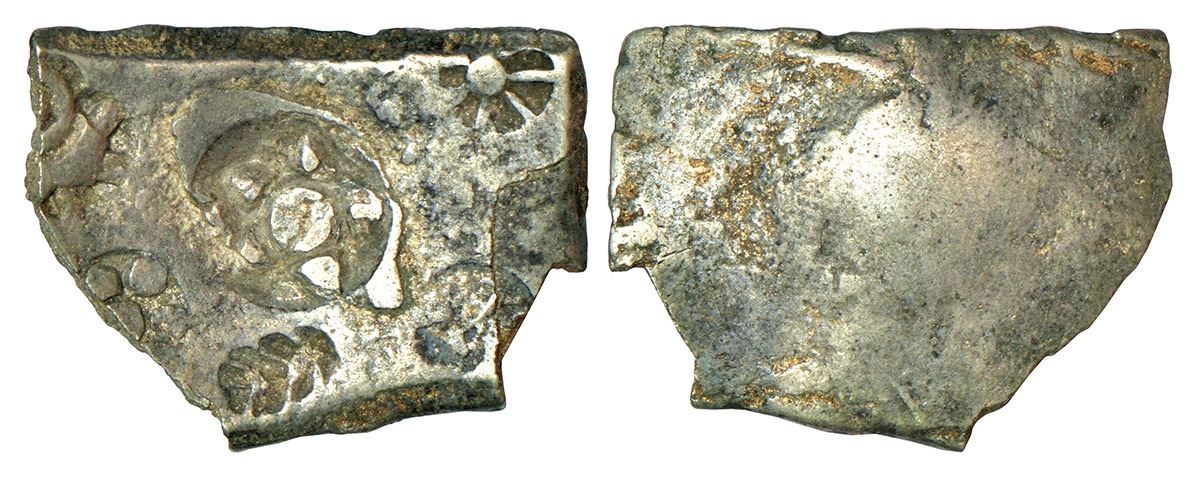 Archaic silver punch-marked coin, Ghagra-Gandak River Valley region, 'Narhan hoard' type, (c.400-350 BC), 5-Shana or 1½ Vimshatika standard, similar to Rajgor 522 (attributed to 'Shakya Janapada'), 5.06g. Obv: Single deep punch of a star-like symbol, made up of five triangles around a central dot and many small ancillary punches. Rev: Plain; slight broken from edge.