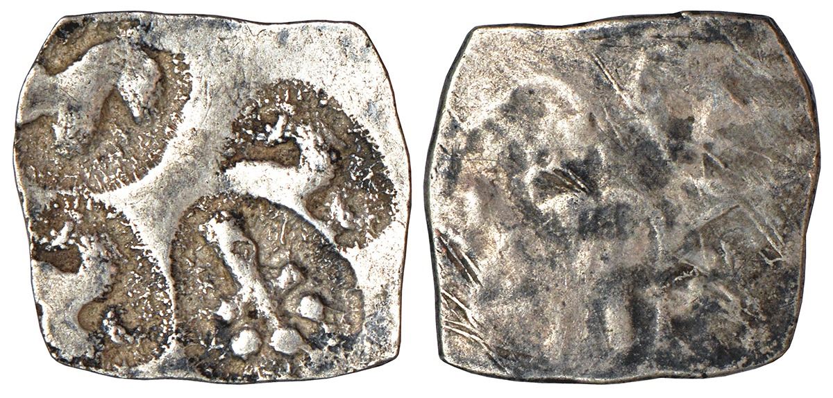 Archaic silver punch-marked coin, Godavari Valley region, usually attributed to 'Ashmaka Janapada', ½ Karshapana (underweight), ABBC configuration, (400-350 BC), not listed in Rajgor, 0.95g. Obv: four punches: 1x hare facing left, 2x treskelis symbols, 1x palm tree.