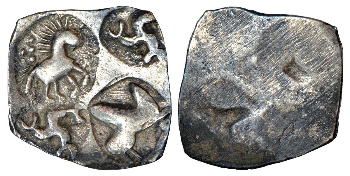 An exceptionally rare early depiction of horse among the punch-marked coinages of Ancient India.