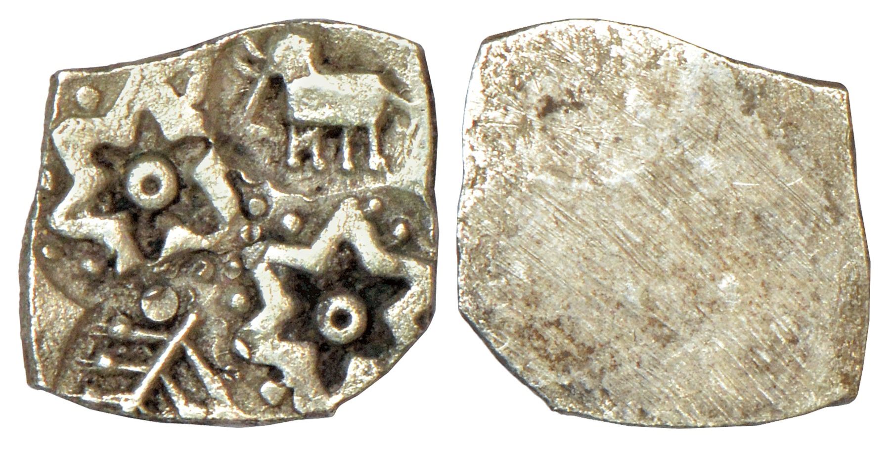 Ancient India: Archaic silver punch-marked coin, Godavari Valley region, ½ Karshapana, 1.49g.