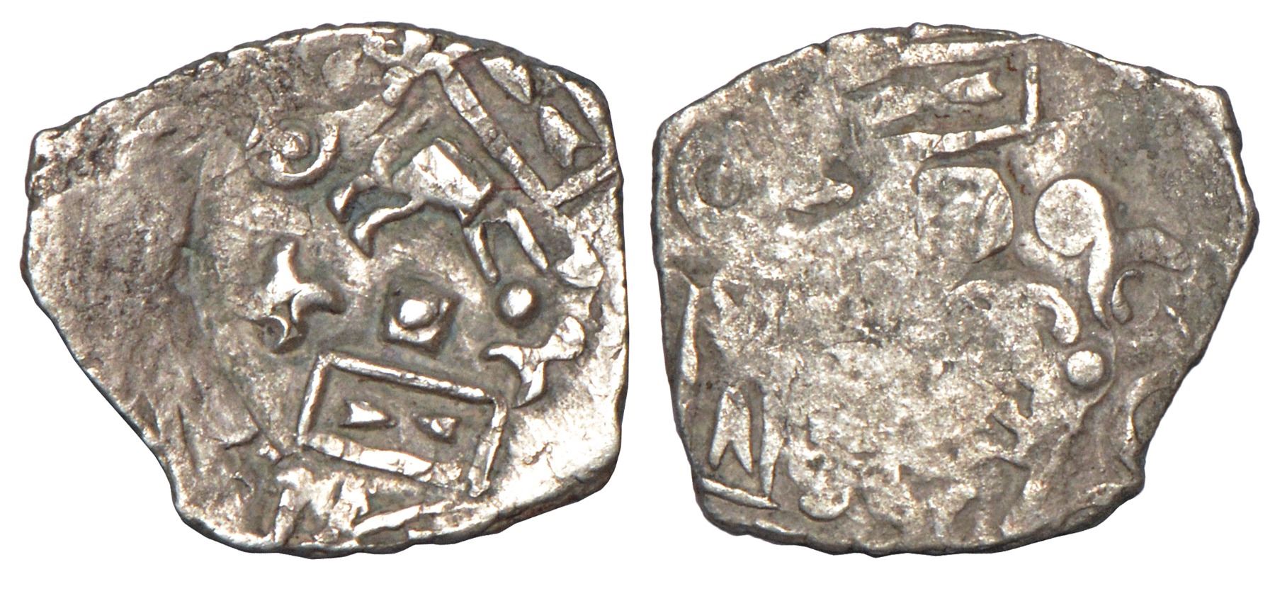 Archaic silver punch-marked coin, Saurashtra region, usually attributed to 'Surashtra Janapada', 'buffalo' type, (300-250 BC), not listed in Rajgor or van't Haaff, 0.84g. Obv: Buffalo with wide horns in centre, ancillary symbols like 'Swastika, taurines and annulets around; fishes in a pond below (struck twice). Rev: Traces of an undertype.