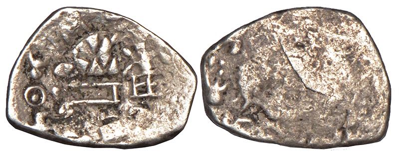 'Archaic silver punch-marked coin, Saurashtra region, usually attributed to 'Surashtra Janapada', 'hill and tree' type, '(300-250 BC), similar to Rajgor 412c but positions of tree and hill reversed, 0.67g. Obv: Hill of six pellets, above a tank with fishes in it, a tree to right; small ancillary symbols around. Rev: Traces of an undertype (most likely fish).