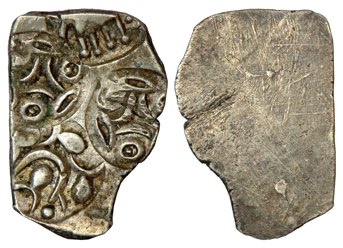 Archaic silver punch-marked coin, Tapi-Wainganga Valley region, usually attributed to 'Vidarbha/Ashmaka Janapada', ½ Karshapana, ABBC configuration, (400-350 BC), not listed in Rajgor, 1.62g. Obv: Four punches: 1x elephant facing left, '2x tripoint symbols composed of semicircles, annulets and 'barley'-grain shapes, 1x a taurine within a crescent with three taurines in a CCW movement.