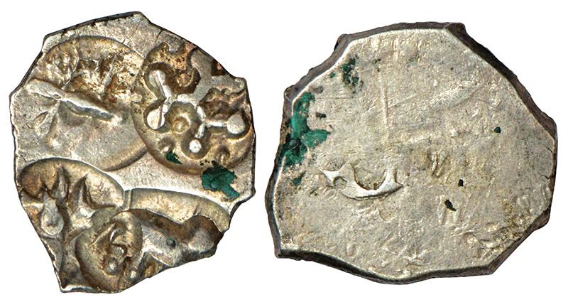 Archaic silver punch-marked coin, Upper Wainganga Valley region, usually attributed to 'Vidarbha Janapada', ½ Karshapana, ABCD configuration, (400-350 BC), not listed in Rajgor, 1.67g. Obv: Four punches: 1x elephant facing right, 1x bold Nandipada and crescents, 1x '3-Y' symbol, 1x tree with branches.