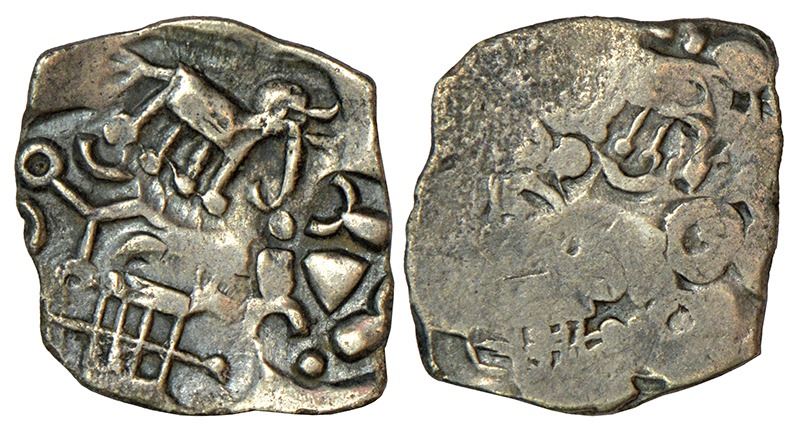 Archaic silver punch-marked coin, Wainganga-Wardha Valley region, usually attributed to 'Vidarbha Janapada', ½ Karshapana, ABCD configuration, (400-350 BC), not listed in Rajgor, 1.17g. Obv: Four punches: 1x elephant facing right, 1x tripoint symbol with crescents, 1x three taurines around a triangular dot, 1x bulls yoked to a plough. Rev: Traces of an undertype.