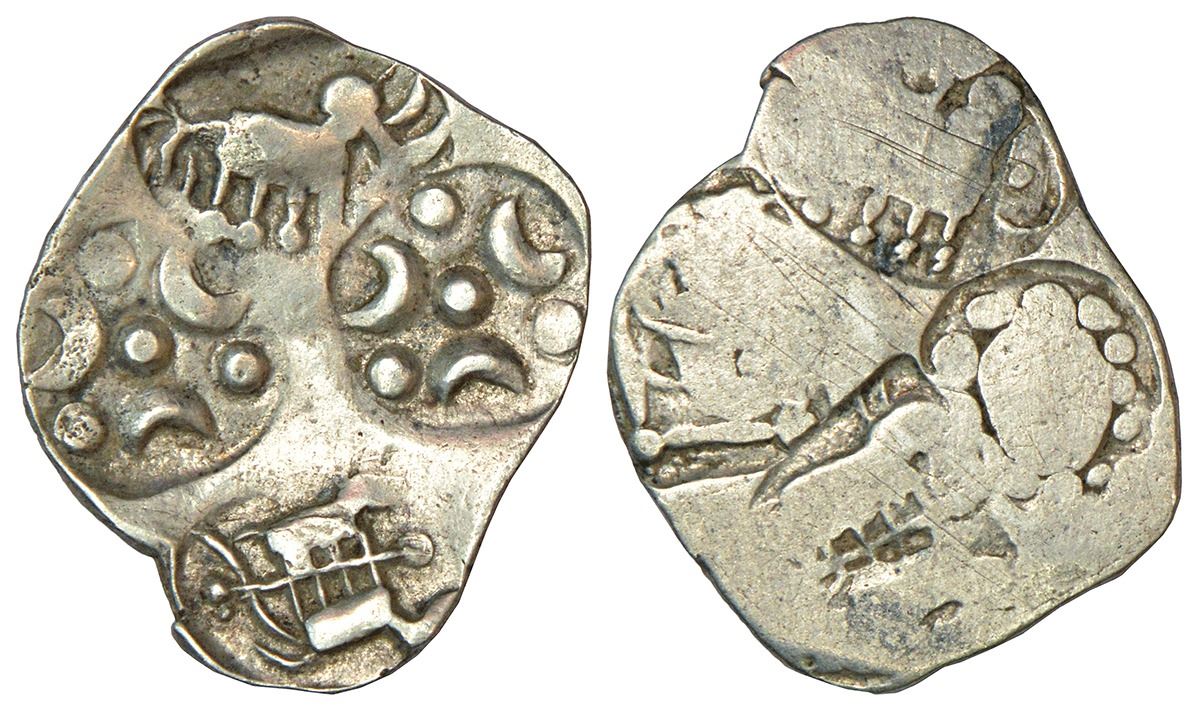 Archaic silver punch-marked coin, Wainganga-Wardha Valley region, usually attributed to 'Vidarbha Janapada', ½ Karshapana, ABBC configuration, (400-350 BC), not listed in Rajgor, 1.19g. Obv: Four punches: 1x elephant facing right, 2x tripoint symbol with crescents and dots, 1x bulls yoked to a plough. Rev: Traces of an undertype.