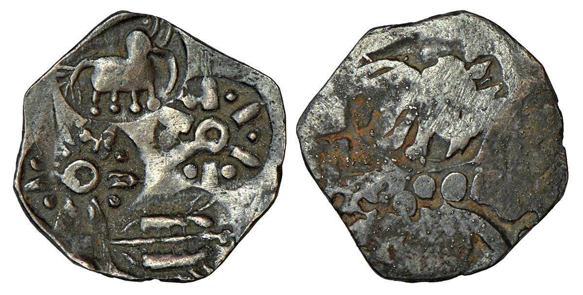 Archaic silver punch-marked coin, Wainganga-Wardha Valley region, usually attributed to 'Vidarbha Janapada', ½ Karshapana, ABBC configuration, (400-350 BC), not listed in Rajgor, 1.21g. Obv: Four punches: 1x elephant facing right, 2x six-rayed symbols with dots, 1x bulls yoked to a plough. Rev: Traces of an undertype.