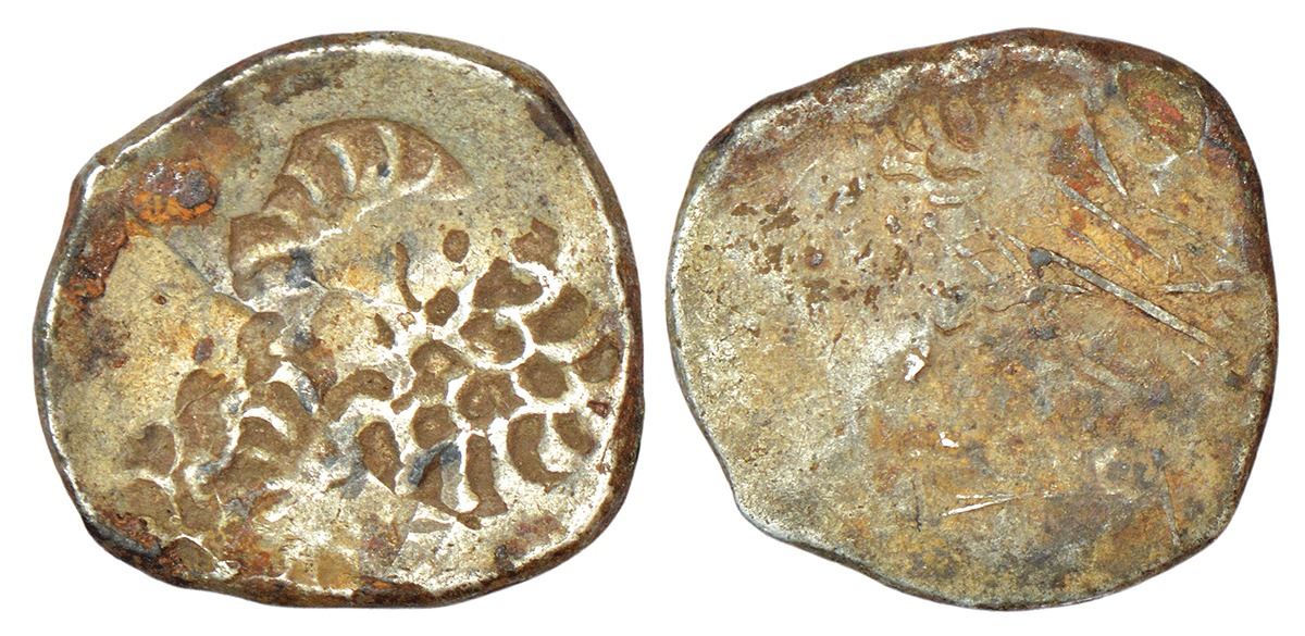 Archaic silver punch-marked coin - middle Ganges valley region, 'Jakhania hoard' type, traditionally attributed to 'Kasi Janapada under Kosala Janapada', (c.400-300 BC), ABBC configuration, Vimshatika standard, Rajgor series 58, 4.76g. Obv: Four punches - 1. Whorl with anticlockwise prongs, 2. Complex linear symbol, 3. Sun symbols with anticlockwise curvy extensions. Rev: one small banker's mark and some striate marks.
