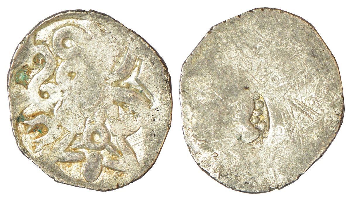 Archaic silver punch-marked coin - middle Ganges valley region, 'Rath hoard' type, traditionally attributed to 'Kosala J anapada', (c.400-300 BC), ABCD configuration, light-weight Karshapana standard, similar to Rajgor series 60-62 but not l isted as a type, 2.62g. Obv: four punches - 1. The '3-S' symbol, 3. Hare / rabbit facing left, 3. A six-armed symbol with three arrows and three pellets alternating around a circle 4. Two semicircles opposite to each other. Rev: a small 'banker's mark'.