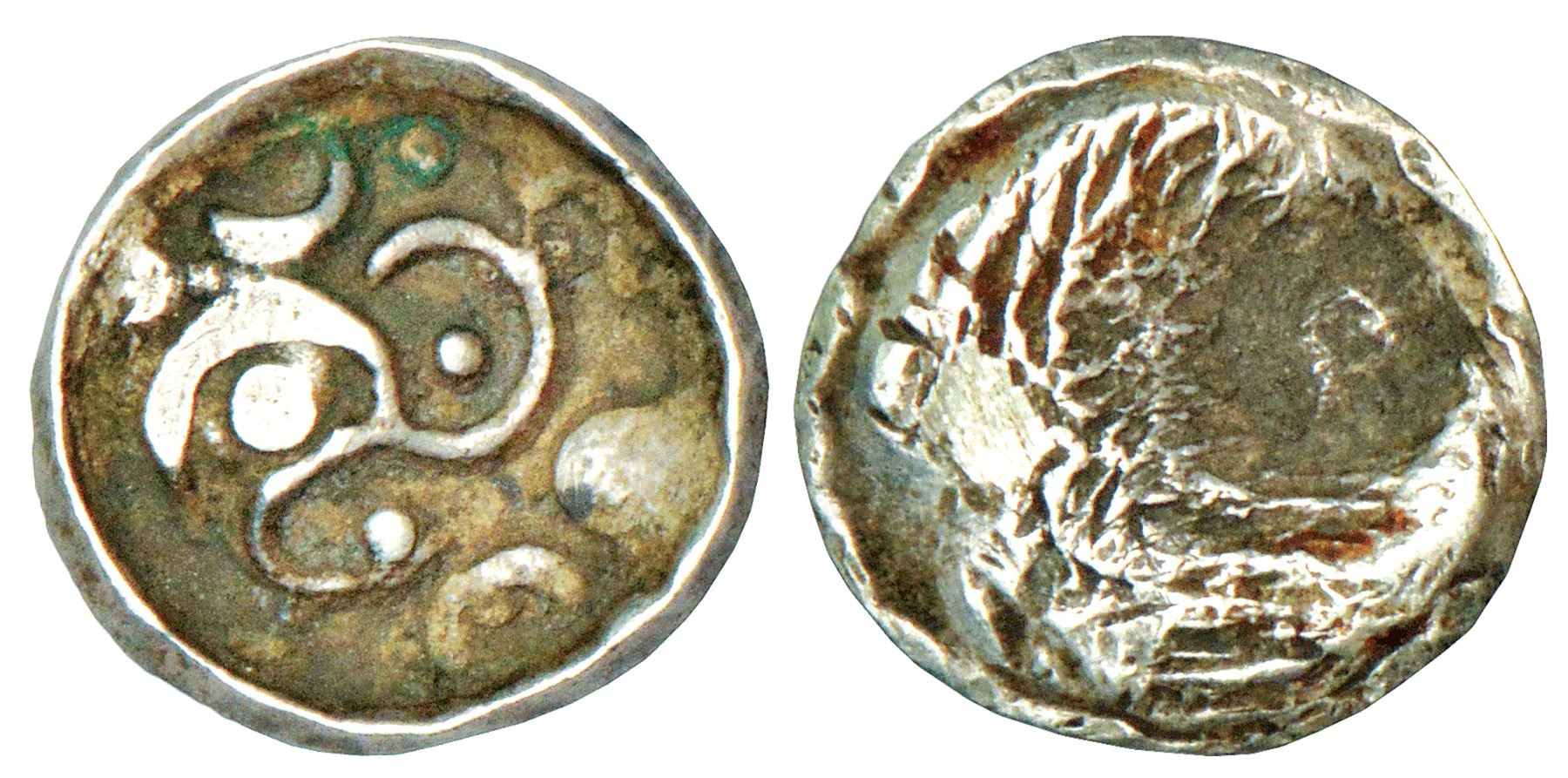 This coin is similar in fabric to Rajgor Series 79, which has a triangular symbol punched in the centre, and conforms to the ¼ Karshapana weight standard. This series is known only from a single hoard, now in the Lucknow Museum and does not correspond to any known 'Janapada' area.
