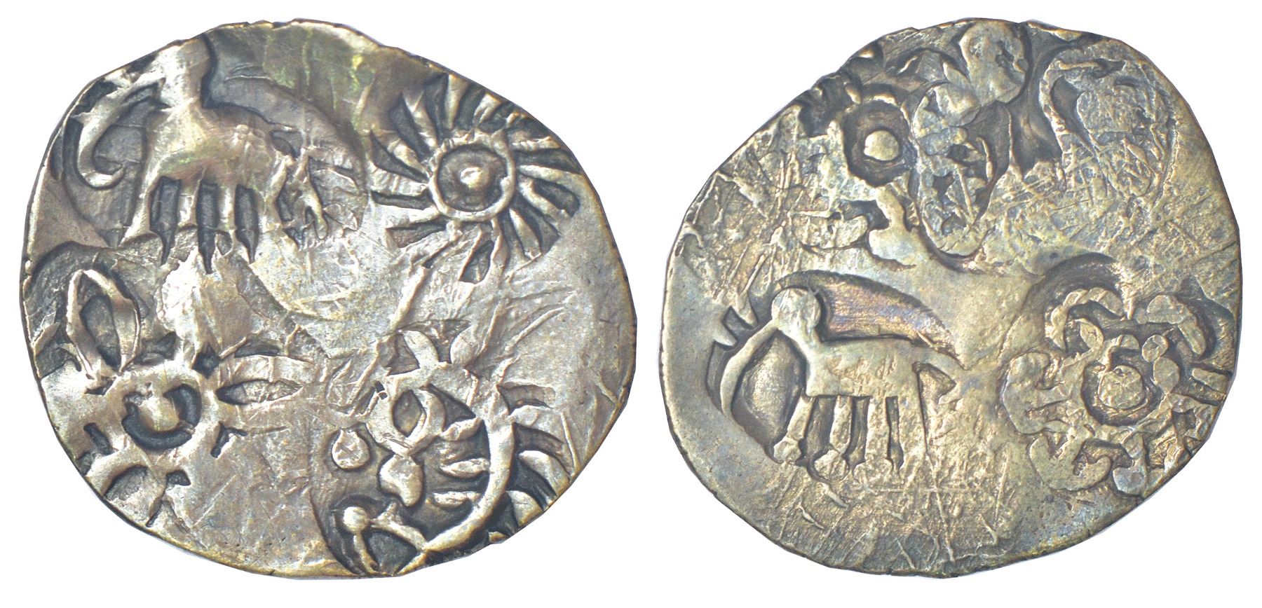 Archaic silver punch-marked coinage, Son valley series, attributed to 'Vatsa Janapada', (c.500-400 BC) - silver karshapana, Hardekar 2019 - SN. 20 and 21, 2.99g. Obv: Four symbols in ABCD configuration - 1. 'scorpion' with taurine in it, 2. sun, 3. elephant standing facing left, 4. six-armed symbol. Rev: traces of an undertype.