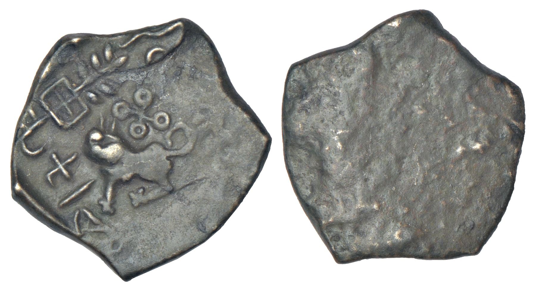 Ancient Central India, Betwa valley - die-struck copper coin of Kurapurika city state, (c.200-150 BC), PAIC 828 (plate specimen), 6.25g. Obv: Small lion seated facing left, tree-in-railing to left, 'Ujjain' symbol above, semi-circular pond with zigzag lines to lower left; Brahmi legend …sakura to left. Rev: Blank.