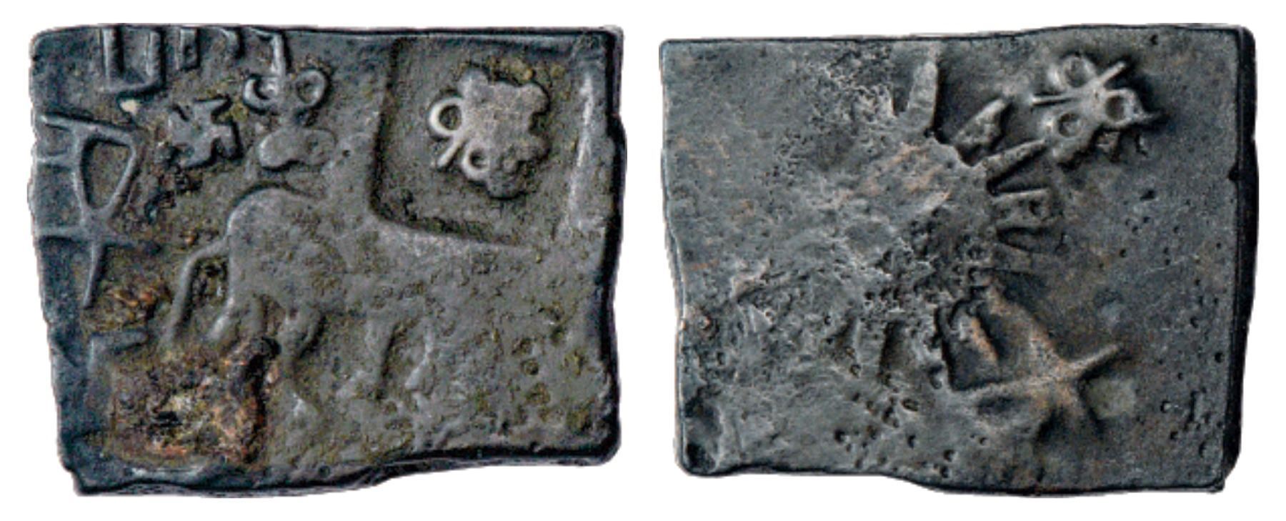 Ancient, copper coin of Patalatoļata from West Marathwada / East Vidrabha region, 8.40g. Obv: Bull standing to right, Swastika and Shrivatsa above its back, triangle-headed standard behind; brahmi legend Pata… above. Countermarked by a 'Nandipada within a square incuse. Rev: Double-circled 'Sunburst' motif, surrounded by Shrivatsa, Nandipada, Triangle headed standard and Swastika (two symbols visible).