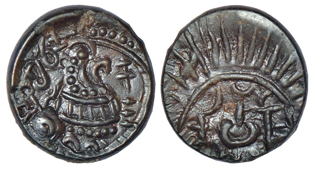 Eastern Chalukyas - alloyed copper coin of Kubja Vishnu Vardhana (624-641 AD) alias Vishamasiddhi in 'Vishnukundin' fabric, similar to MCSI 184-185, 2.82g. Obv: maned lion standing with one paw raised, with tail curled on the back, facing right; dagger to right and Brahmi legend …Vishama… above. Rev: Kalasha (vase of plenty) resting on a lotus between two lamp stands, enclosed in rayed circle.
