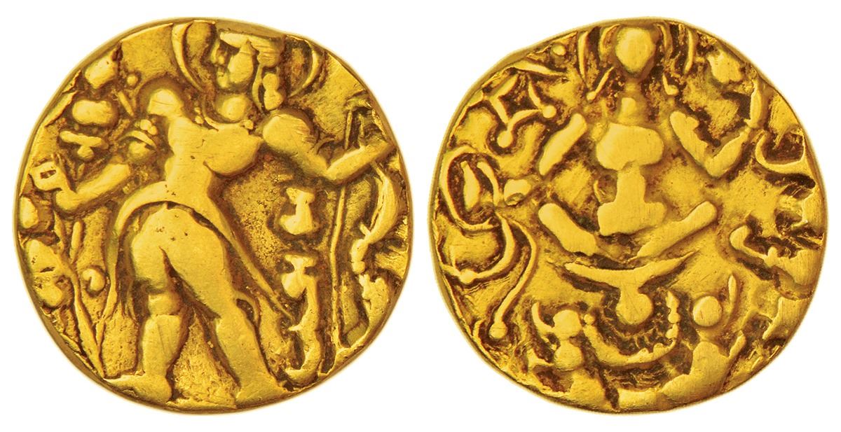 Gupta Empire, gold dinar of Chandra Gupta II (375-415 AD), 'Archer-Goddess on Lotus' type, S. Kumar Class III, var. A.6.1, 7.67g. Obv: Nimbate king standing facing left in tribhanga posture wearing tunic, holding a strung bow in his left hand and an arrow in his right hand, with Garuda standard to left, Brahmi legend Chandra below the king's arm. Rev: Nimbate goddess Lakshmi seated cross-legged on a lotus in padmasana, holding a long-stalked lotus flower in her