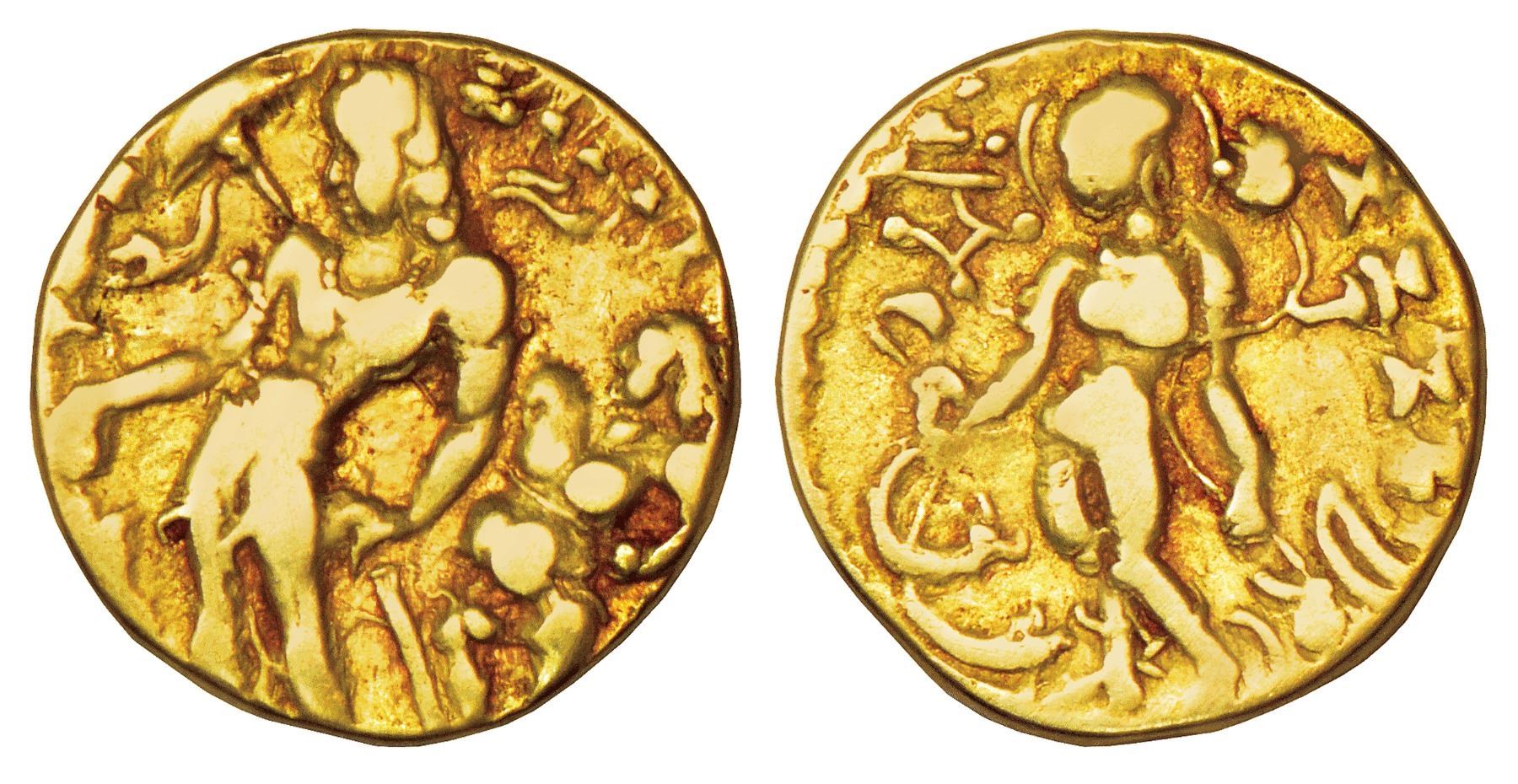 Gupta Empire, gold dinar of Chandra Gupta II (375-415 AD), 'Chhatra' type, Altekar Class II ('metrical legend'), var. D, 7.56g. Obv: Bare-bodied king, standing facing left with his fist on the hilt of the sword he carries, offering sacrifice at an altar. A pot-bellied dwarf attendant stands behind holding the royal parasol (Chhatra) above his head & traces of brahmi legend in exergue. Rev: Nimbate goddess Lakshmi standing three-quarters profile in a Tribhanga pose, holding a lotus in one hand and a long cloth/ribbon in the other; brahmi legend Vikramaditya to the right and tamgha to left.