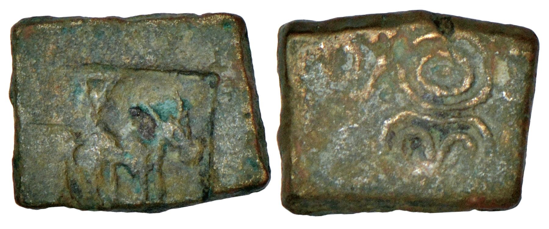 Ancient North-Central Deccan region, fractional copper coin of Kutapada, 'Gajalakshmi' type, 2.65g. Obv: Gajalakshmi motif completely obliterated by a countermark of bull within deep rectangular incuse. Rev: Bold Nandipada drawn with double lines; double circle with traces of Shrivatsa above to right.