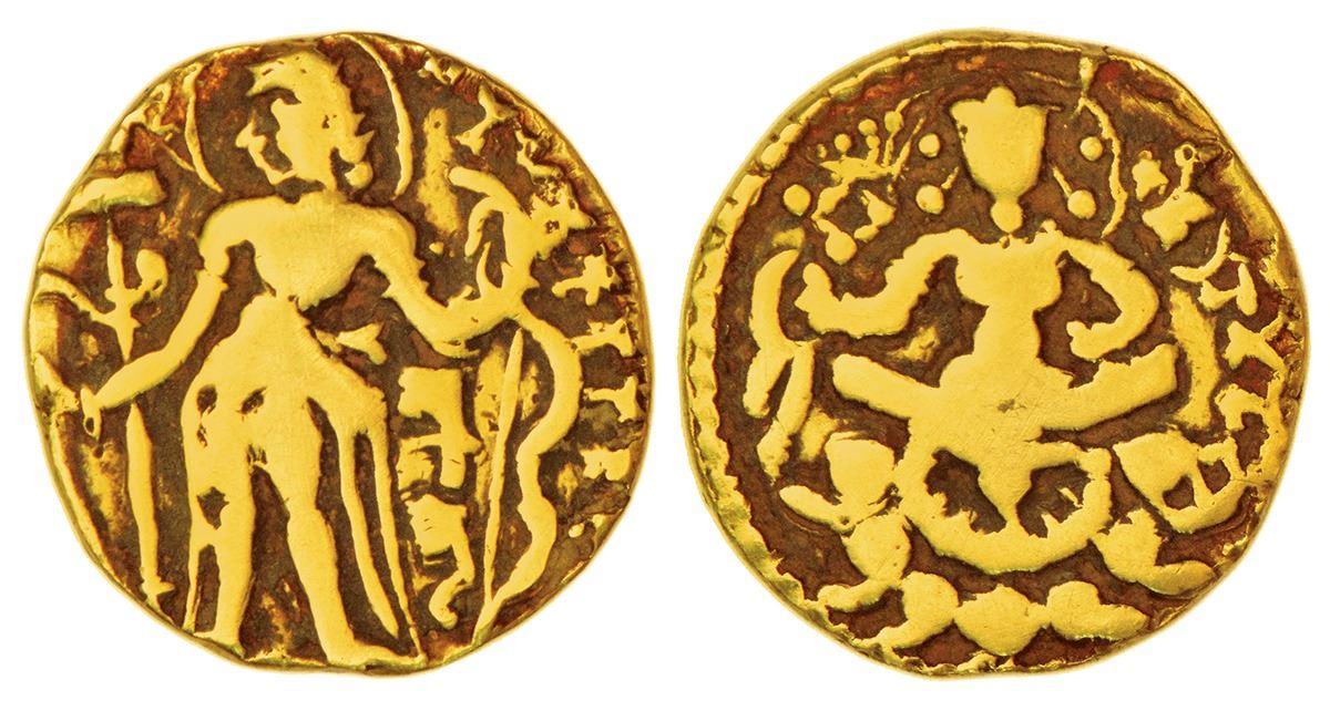 standard to his left, Brahmi legend Skanda below the king's arm; traces of Brahmi legend Parahitakariraja…. along the right margin. Rev: Nimbate goddess Lakshmi seated cross-legged on a lotus in padmasana, holding lotus in her left hand and a diadem in her right hand; with Brahmi legend Kramadityah to right and a tamgha in the left field.