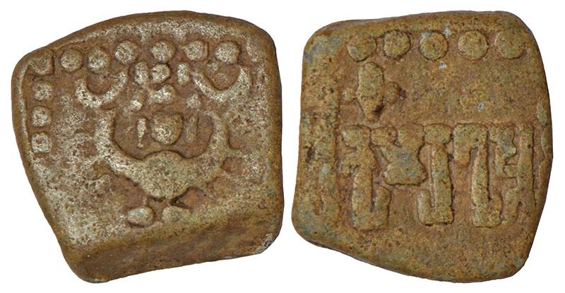 Gupta Empire, lead coin of Kumara Gupta (415-450 AD), Western India/Gujarat 'Garuda' type, Pieper 890, 3.74g. Obv: Facing Garuda flanked by crescents on either side and a sun symbol above its head. Rev: Brahmi legend Shri Kumara Gupta with a small wheel in axial perspective above the letter Ku.