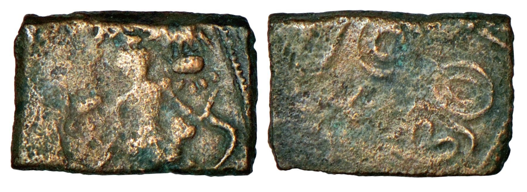 Ancient North-Central Deccan region, fractional copper coin of Kutapada, 'Gajalakshmi' type, 1.75g. Obv: Lakshmi seated on lotus being anointed by a pair of elephants pouring water over her from pots held in trunks. Rev: Bold Nandipada drawn with double lines; double circle with traces of Shrivatsa above to right.