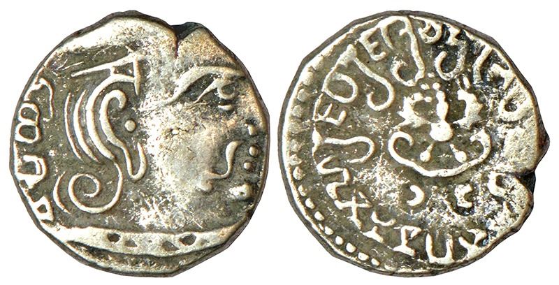 Gupta Empire, silver drachm of Chandra Gupta II (375, 415 AD), 'Western India' type, dated GE86, S Kumar Class I, 2.12 g. Obv: Profile bust of king to right, date Varshe 86 behind the head. Rev: Garuda emblem in centre, Brahmi legend…Bhagavata Maharajadhiraja Shri Chandra… around.