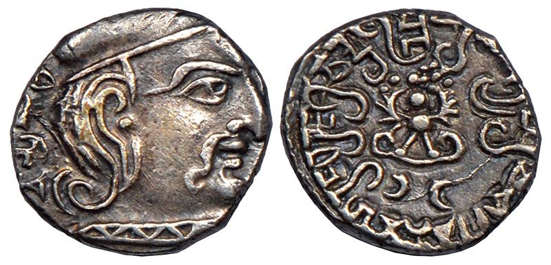 Chandra Gupta II struck silver coins of the 'Western' type soon after his conquest of Gujarat. The earliest of these issues - like this one - have a date in Shaka Era, rather than Gupta Era. Known only for SE329, they are very rare issues, particularly with portions of date visible.
