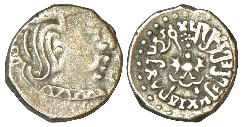 Gupta Empire, silver drachm of Kumara Gupta I (415-450 AD), 'Western India' type, not listed in S Kumar, 2.14g. Obv: Profile bust of king to right, traces of date behind the head. Rev: Garuda emblem in centre, dotted sun to right; truncated Brahmi legend inscribed in reverse sequence, anticlockwise from 9 o'clock Parama Bhagavata Maharajadhiraja Shri Kumara Gupta Ma-dra-ditya around.