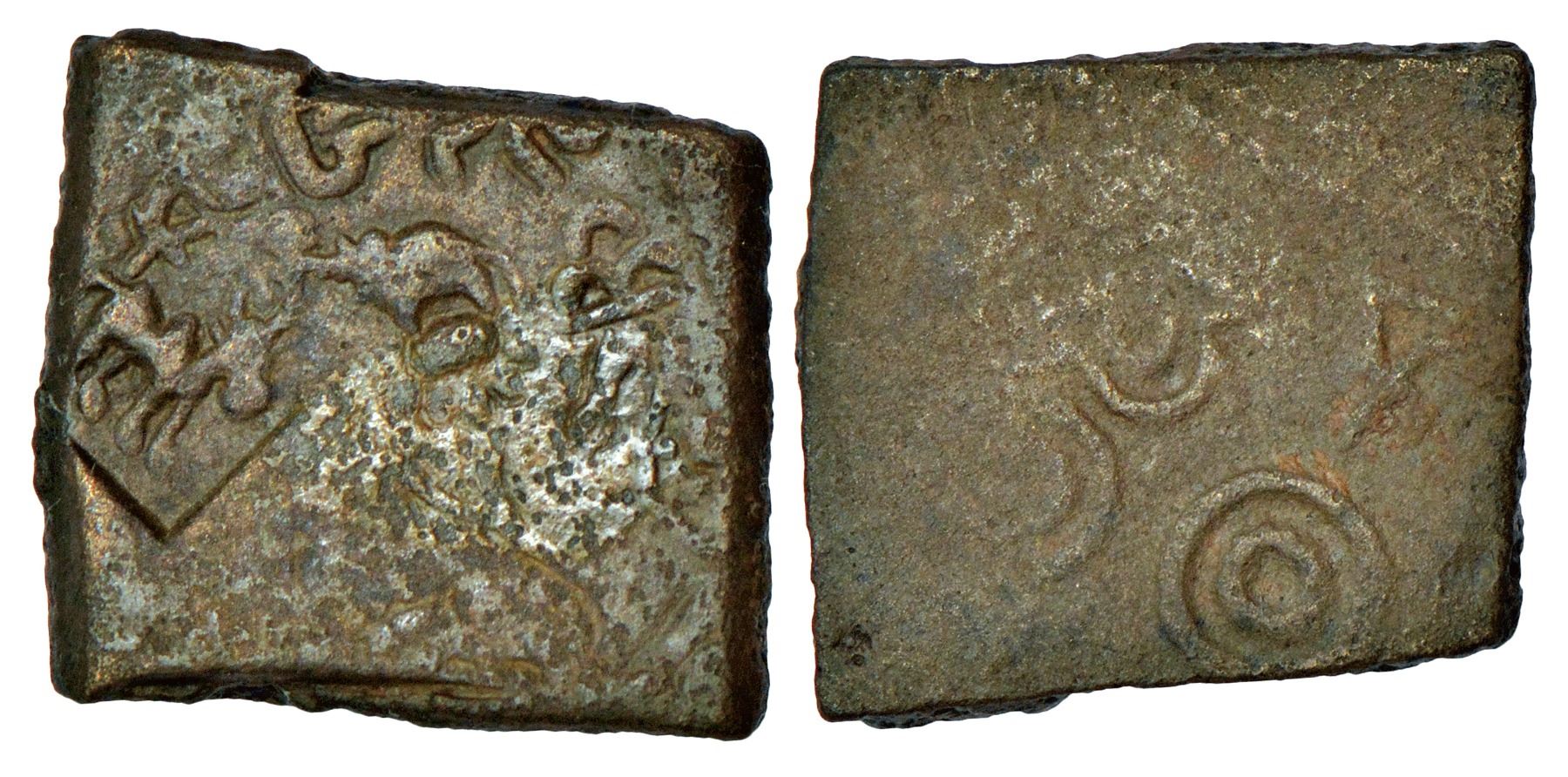 Ancient North-Central Deccan region, copper coin of Kutapada, 'Gajalakshmi' type, 7.73g. Obv: Lakshmi seated on lotus being anointed by a pair of elephants pouring water over her from pots held in trunks (partly visible), the motif is partly obliterated by a countermark of a bull and triangle-headed standard within a square punch; Brahmi legend …tapa(dasa) above. Rev: Bold Nandipada drawn with double lines, double circle to its right with triangle-headed standard above.