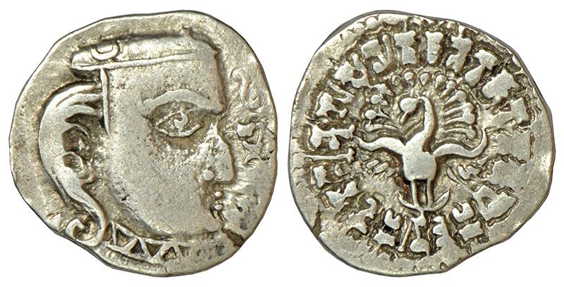 Gupta Empire, silver drachm of Skanda Gupta (450-475 AD), 'fan-tailed peacock' or 'Madhyadesha' type, Altekar Class IV, var. A, S. Kumar Var. A, 2.37g. Obv: Profile bust of king to right, wearing headgear with crescent. Rev: Fan-tailed peacock in centre; Brahmi legend in chaste Sanskrit around Vijitavaniravanipati Jayati Divam Skandaguptoyam विजितवनिरवनिपति जयति दिवं स्कन्दगुप्तोऽयं (having conquered the Earth and the lords of the Earth, Skanda Gupta wins over this Heaven).