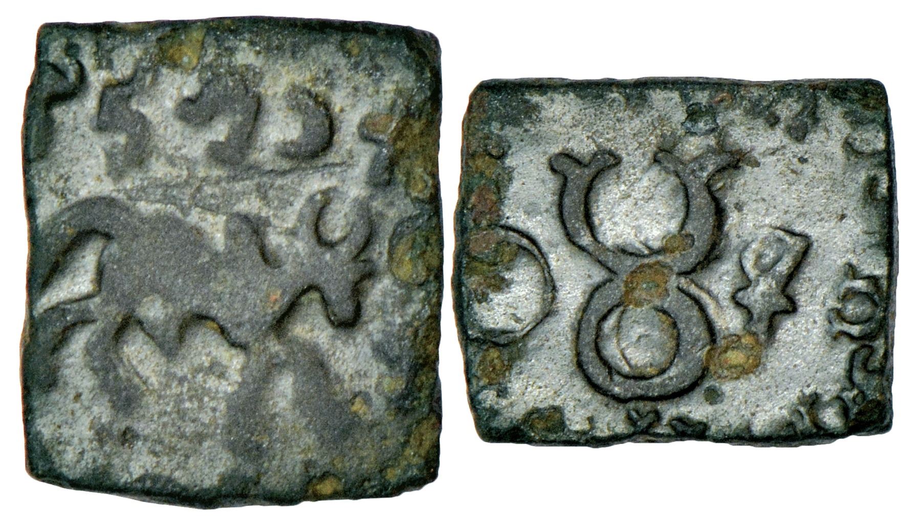 Ancient North-Central Deccan region, copper coin of Kutapada, 'Bull' type (small coin), 4.00g. Obv: Bull walking to right, Brahmi legend Kutapadasa inscribed upside down above. Rev: Bold Nandipada in centre, flanked by a circle to left and triangle-headed standard to right, set within a border of Swastikas and Taurines alternating, 4.00g.
