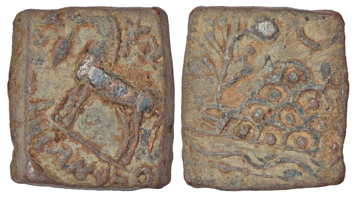 Ancient India: Hiranyakas of Rayalaseema/South-Central Karnataka, lead coin of Mahasenapati Vasithiputa Khadakama (c.250-300 AD), 16.85g. Obv: Horse standing facing left on a pedestal, auspicious symbols (Shrivatsa, Bhadrapeetha, conch shell) around its head; Brahmi legend ...thiputasa Herañakānām Khada(kama)… from 5 to 10 o'clock. Rev: A tree in railing and a ten-arched hill surmounted by a crescent, with wavy line below.