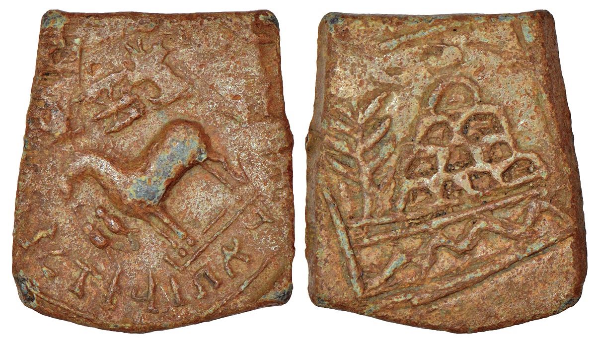 Hiranyakas of Rayalaseema/South-Central Karnataka, lead coin of Skanda…, (250-300 AD), unpublished and one of the finest specimens known till date, 13.93g. Obv: Horse standing facing left on a pedestal, auspicious symbols (a pair of fish, Shrivatsa, Bhadrapeetha, fire altar) around its head; Brahmi legend …tasa Herañakānām Khada…. From 5 to 9 o'clock. Rev: Within a rectangular border, a tree and a ten-arched hill surmounted by a crescent, with wavy line below.