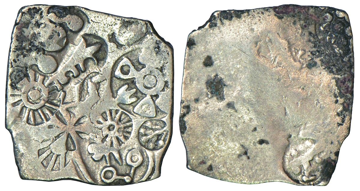 Imperial Magadhan silver punch-marked Karshapana coin (400-350 BC), GH series I, No. 189, 3.33g. Obv: Five punches: 1. Sun, 2. Six-armed symbol, 3. Fish flanked by florets in a rectangle, 4. Yupa with three taurines on the shaft, 5. Dotted annulet flanked by taurines.