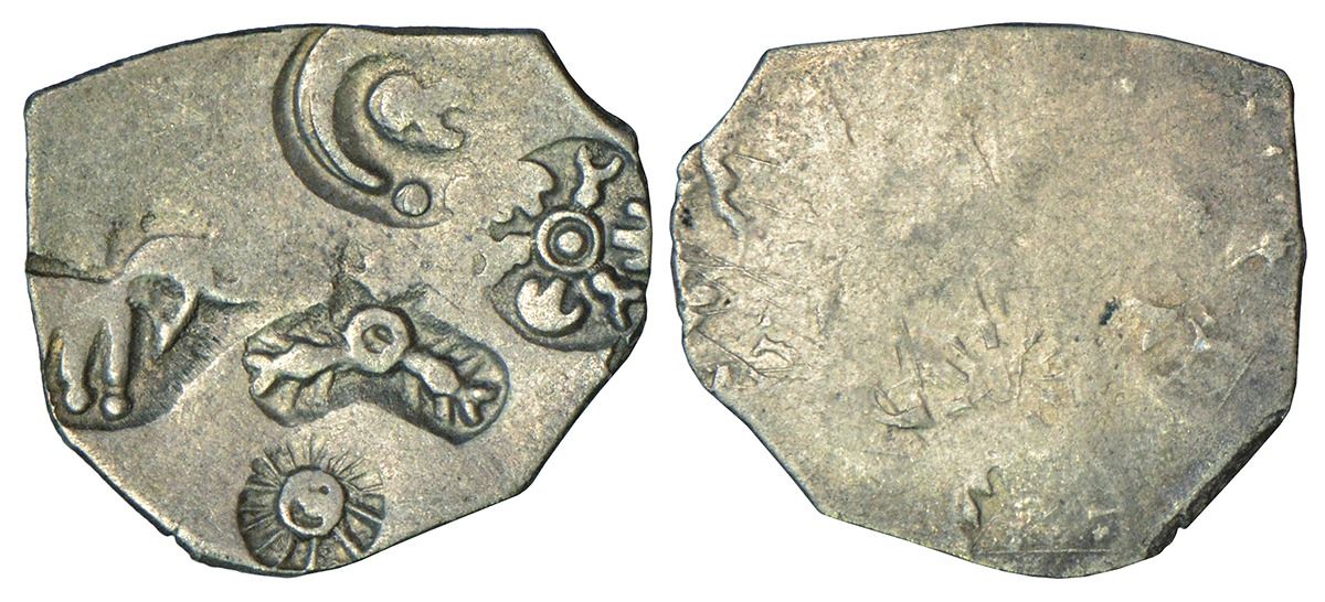 Imperial Magadhan silver punch-marked Karshapana coin (400-350 BC), GH series I, No. 233, 3.33g. Obv: Five punches: 1. Sun, 2. Six-armed symbol, 3. Three fishes around a dot, 4. Taurine in crescent and dots, 5. Elephant to right.