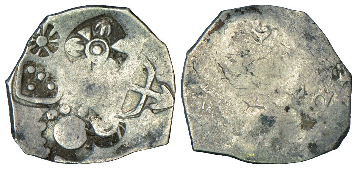 Imperial Magadhan silver punch-marked Karshapana coin (400-350 BC), GH series I, No. 126, 3.38g. Obv: Five punches: 1. Sun, 2. Six-armed symbol, 3. Strung bow and arrow, 4. Taurine in crescent with dots above, 5. Five dots in rectangle.