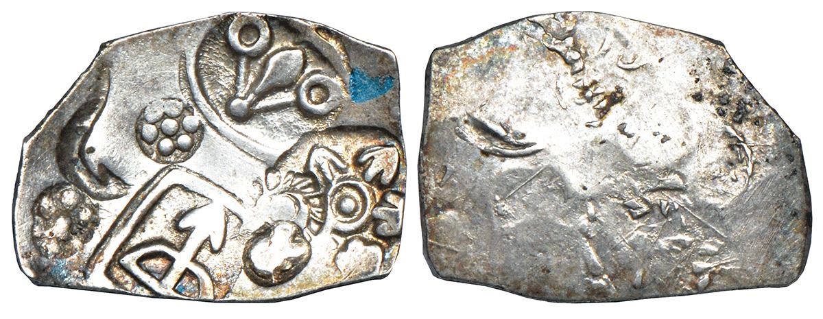 Imperial Magadhan silver punch-marked Karshapana coin (400-350 BC), GH series I, No. 205, 3.48g. Obv: Five punches: 1. Sun, 2. Six-armed symbol, 3. Strung bow and arrow within square, 4. Floret-like symbol in ellipse, 5. Elephant to right.