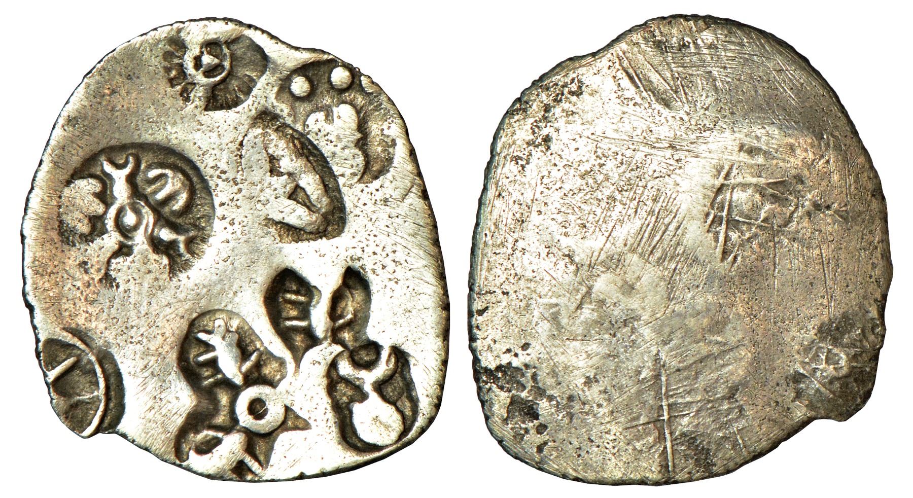 Imperial Magadhan silver punch-marked Karshapana coin (c.400-350 BC), GH series I, no. 237, 3.19g. Obv: Five punches - 1. Sun, 2. Six-armed symbol, 3. Three fishes around a dot, 4. Taurine in crescent and dots, 5. round-shaped leaf.