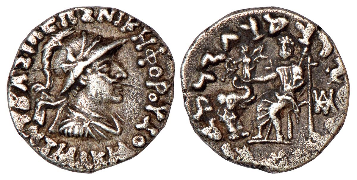 Indo-Greeks, Antialkidas (130-120BC), silver drachm, BN series 13C, 2.26g. Obv: Diademed, draped, and cuirassed bust of Antialkidas facing right, wearing crested helmet adorned with bull's horn and ear; Greek legend BASILEOS NIKEPhOROU ANTIALKIDOU around. Rev: Zeus Nikephoros enthroned slightly left; to left, forepart of elephant to left, holding wreath in its trunk, monogram to right; Kharoshthi legend Maharajasa Jayadharasa (Amtialikidasa) around.